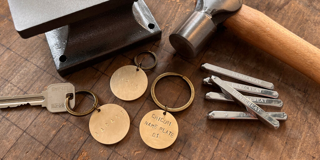 金属専用のアルファベット刻印棒とハンマーを使い、自分の手で一文字ずつプレートに文字を打ちつけていく工程は、シンプルながらとても集中できる時間。